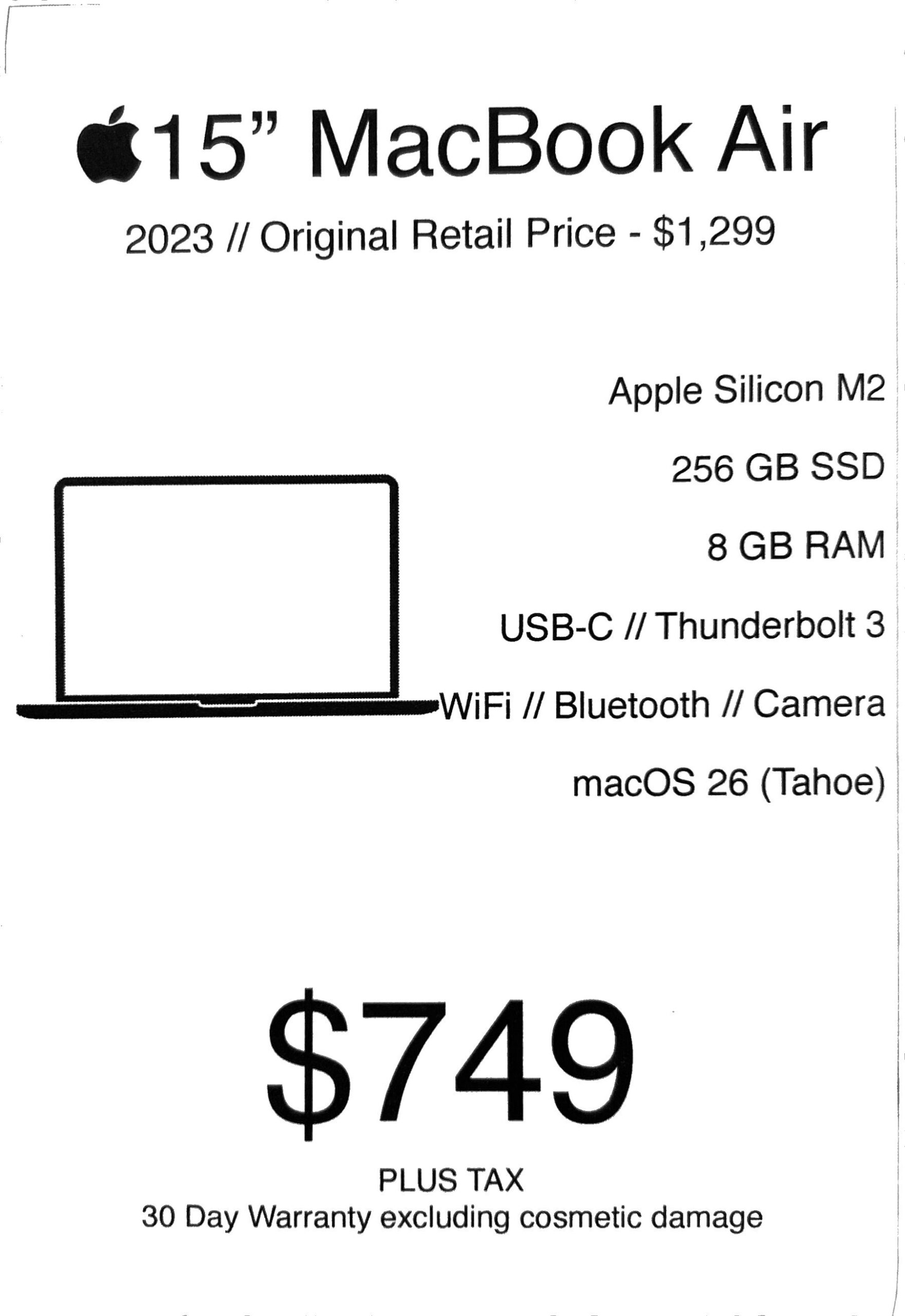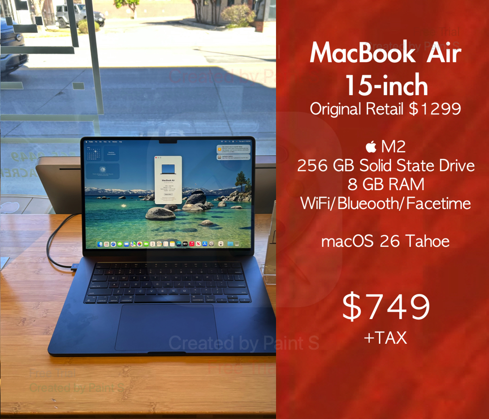 2023 15" MacBook Air M2 - Apple Silicon M2 256 GB Solid State Drive 8 GB RAM macOS 26 Tahoe Apple Silicon with Apple Intelligence Support”